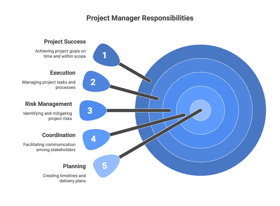 A Project Manager’s job is to make sure work gets done on time, within scope, and with as few surprises as possible. They live in the world of execution. Typical responsibilities include: