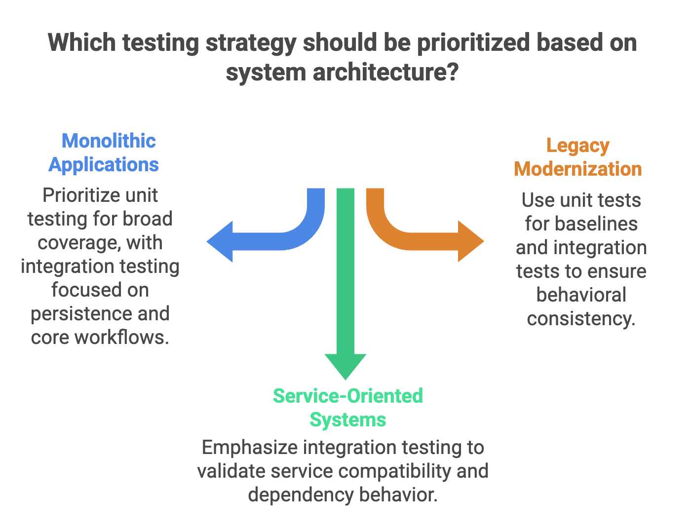 Legacy modernization introduces additional constraints. Unit tests help establish behavioral baselines, while integration tests help ensure that externally visible behavior remains consistent as systems are restructured.